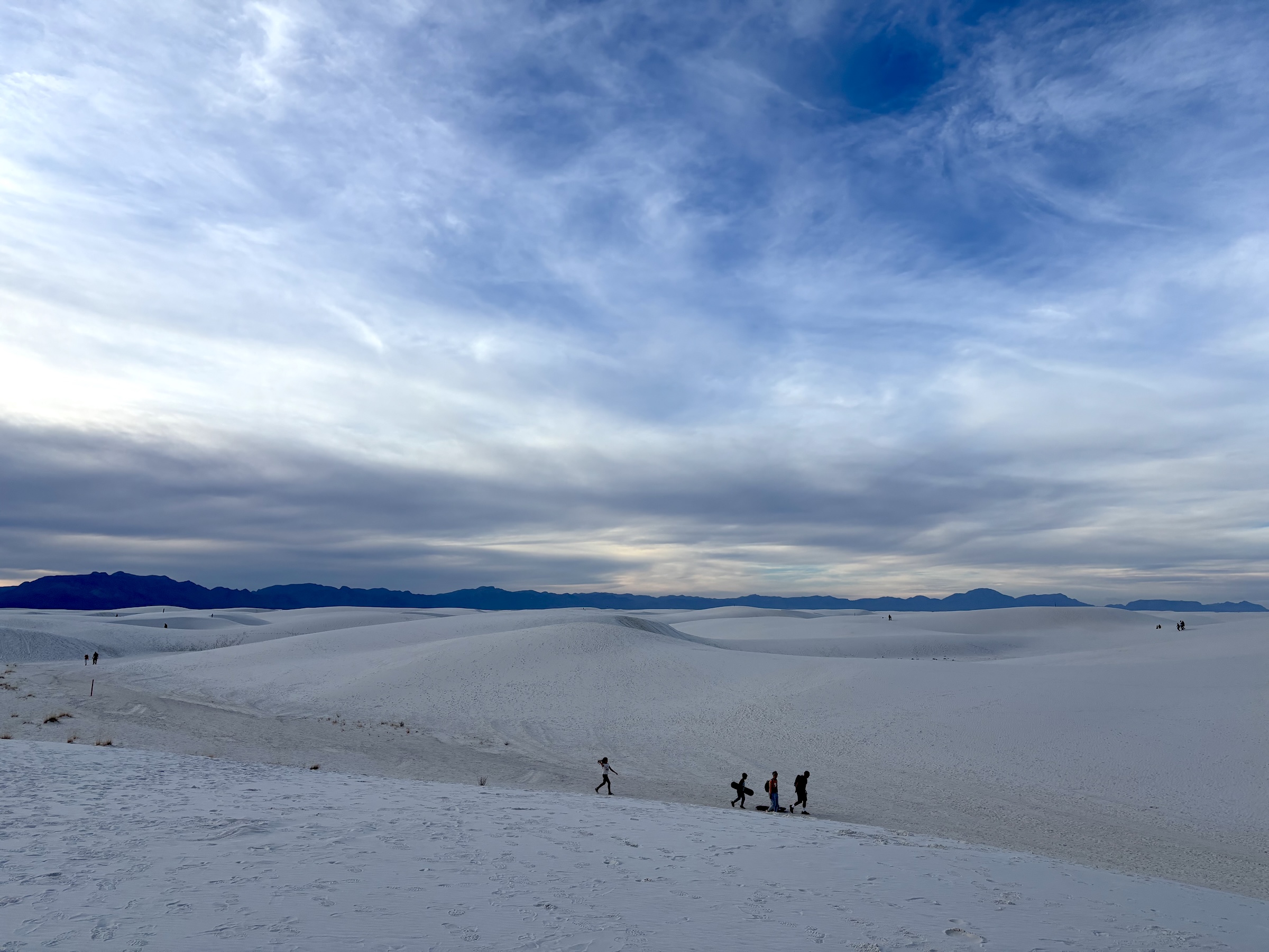 刚降落在新墨西哥,第一眼的景象让我有种置身加州某个无名小镇的错觉——看不到尽头的荒漠、双向八车道的高速公路、飞驰而过的皮卡车,一切都显得熟悉而寻常。然而,沿着公路渐渐驶入内陆,我才慢慢感受到这里的独特。土色的低矮房子、顶端平坦如桌的山脉(Mesa)、细腻如雪的白沙地,新墨西哥有它专属的形状与颜色。在其他城市,有时我会短暂地忘记自己身处何处,但在这里,从未有过那种恍惚感。